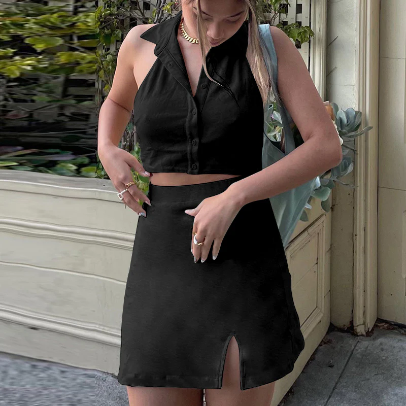Solid sporty 2-piece set, including collared button down top with matching mini skirt.